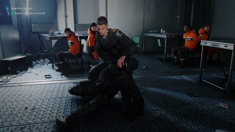 Por sorte, Bond é bom em ganhar vantagem. Você pode derrubar os inimigos de superfícies para atordoá-los ou pegar objetos usando o botão triângulo para acertá-los. Segurando L1, você também tem acesso a todos os seus dispositivos durante combates físicos e com armas, podendo usar o laser de seu Q Watch para cegar os oponentes ou manipular algo para derrubá-los antes de partir para um ataque mais agressivo. Com um inimigo desnorteado, você pode neutralizá-lo pressionando os botões X e círculo ao mesmo tempo.