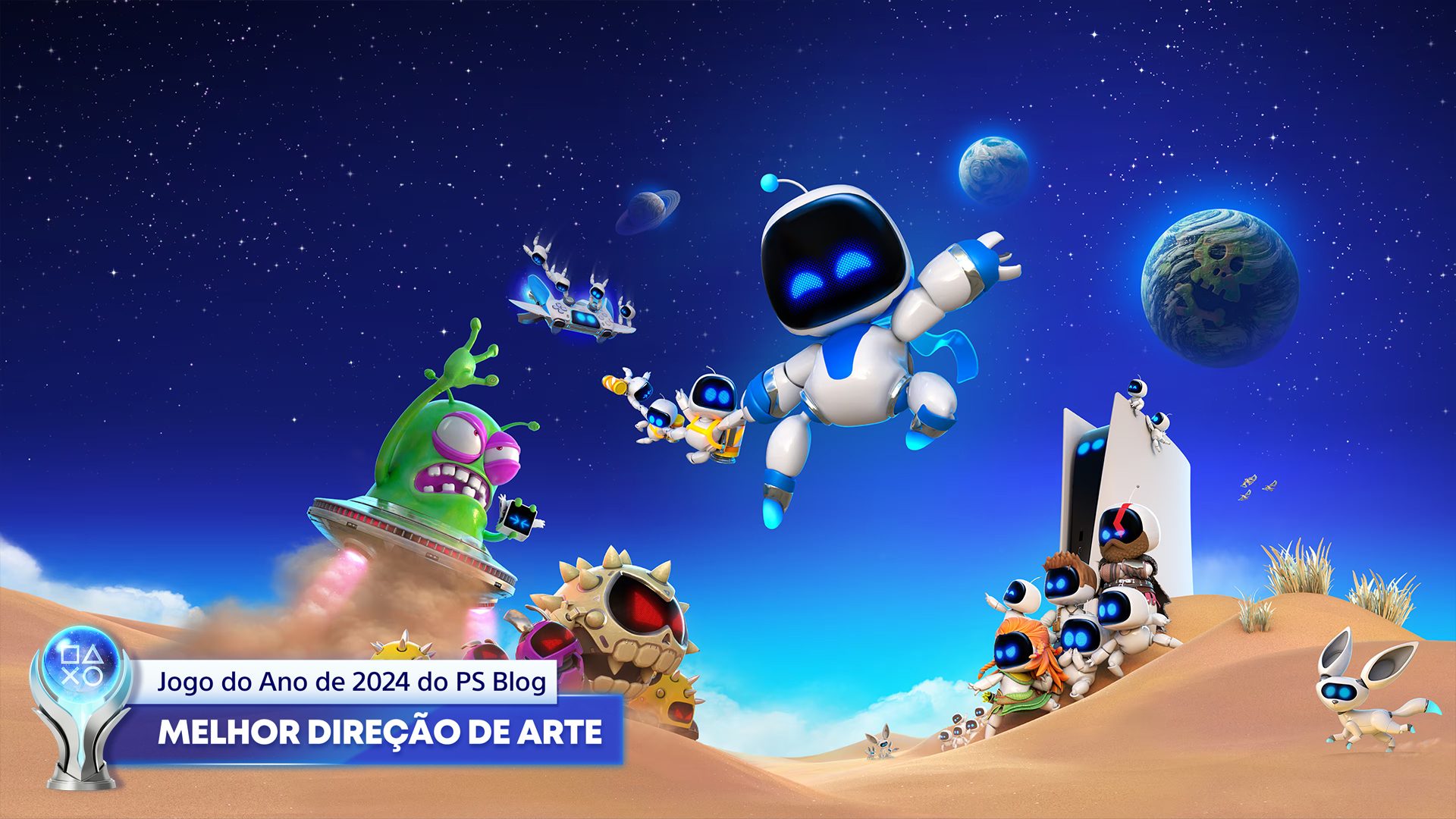 Grandes experiências de jogos foram lançadas ao longo de todo o período de 2024, e quatro delas, em particular, foram as mais lembradas por muitos votos. A aventura de RPG luxuosa e expansiva de Final Fantasy VII Rebirth teve início em fevereiro. A ação de ficção científica da Stellar Blade foi lançada no PS5 dois meses depois, com Black Myth: Wukong, com sua própria abordagem da mecânica de combate, entrou na briga em agosto. Mas foram as aventuras de plataforma do Astro Bot, lançado em setembro, que receberam a maioria dos votos.